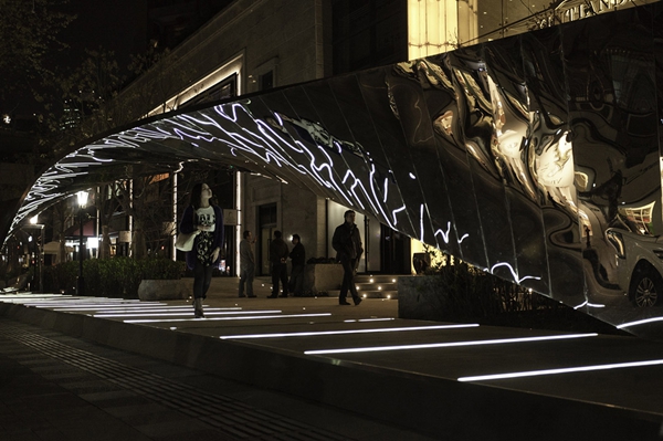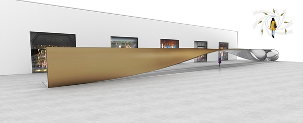 這個(gè)30米長的公共裝置是一整塊造型扭曲反轉(zhuǎn)的板,墻會(huì)自然過渡為天花,路過行人的身影會(huì)被反射。Ben van Berkel說他們希望將這個(gè)裝置做成裝扮公共空間的一個(gè)焦點(diǎn),能夠吸引周圍的公共,人們路過這里就像是在走秀,在這里看自己也看別人,看與被看發(fā)生嶄新的關(guān)系,并產(chǎn)生一種全新的理解周圍觀點(diǎn)的方式。